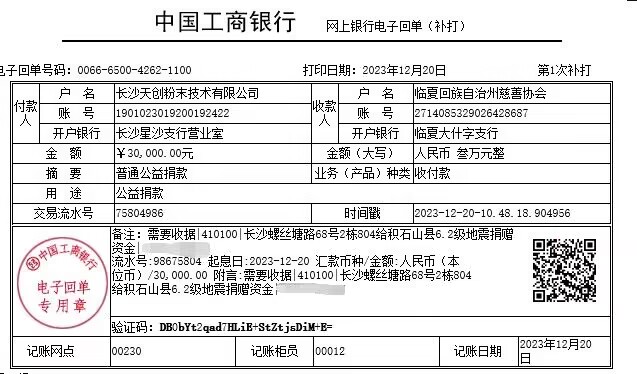 一方有難,八方支援。面對突發災情,社會各界積極響應。長沙天創粉末技術有限公司積極向臨夏回族自治州慈善協會捐贈三萬元進行震區專項救援,積極響應甘肅及青海等受災地區的緊急救援、受災群眾生活保障,過渡安置物資采購以及災后恢復重建等工作。