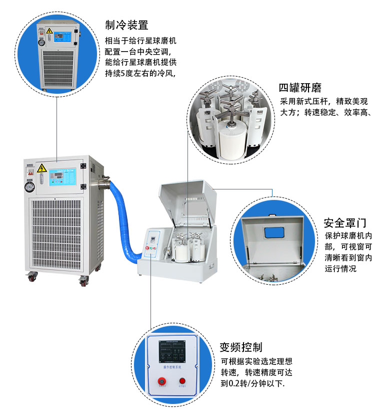 低溫行星球磨機是行星球磨機和制冷裝置組合設備,大部分物料在高速研磨過程中由于摩擦或存在放熱反應等因素會使物料升溫,可能導致物料物理化學性能的改變,產生負面研磨效果。低溫行星球磨機主要應用于需要嚴格控制溫度的物料研磨工藝。