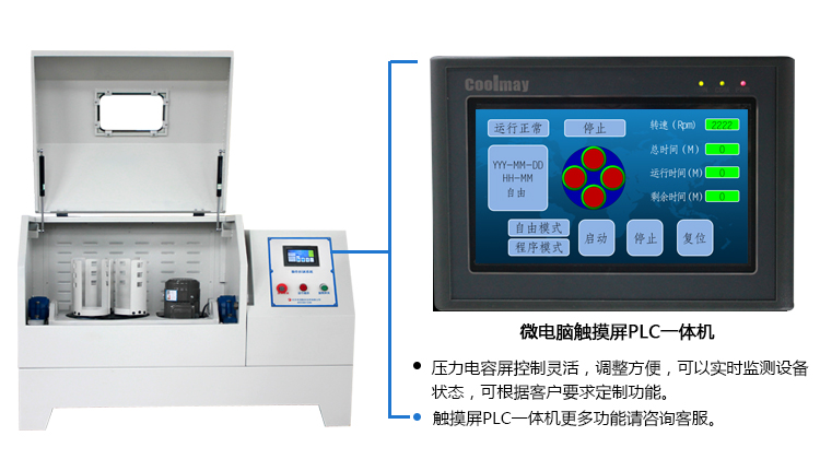 設(shè)備外殼造型設(shè)計新穎、潮流,精益制造,精致、精巧;機(jī)加零件材料嚴(yán)格熱處理工序,采用數(shù)控加工工藝,傳動齒輪選用特殊材料精密齒輪,確保設(shè)備高速運(yùn)行時平穩(wěn)、安全、安靜;磨罐壓緊裝置操作便捷、安全可靠,采用微電腦觸控屏,操作方便,界面簡單直觀,可實現(xiàn)正反轉(zhuǎn)交替控制,有定時和斷電記憶功能 。